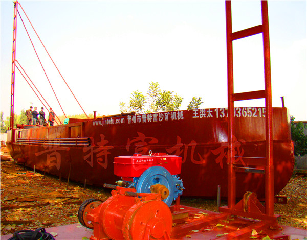 晉特富環(huán)保科技生產(chǎn)的抽砂選鐵船,適用范圍廣,維修費(fèi)用低,是針對厚泥層抽沙選鐵的設(shè)備。1,產(chǎn)品結(jié)構(gòu):本設(shè)備有附體,主架,鉆桿,抽沙泵,高壓打水泵,控制箱,卷揚(yáng)機(jī),發(fā)電機(jī)組,磁選機(jī),平板磁選機(jī),發(fā)沖箱,尾礦輸送設(shè)備等組成。2,抽沙系統(tǒng):抽沙泵8吋-16吋,打水泵6吋-14吋,動力配電機(jī)或柴油機(jī),抽沙鉆桿,用鋼板工鋼焊接,強(qiáng)度大,鉆探深度3-100米,3,選礦設(shè)備:JTF-磁1530磁選機(jī)1-3臺,JTF-pb3040平板磁選一套,4,尾礦輸送設(shè)備:輸送帶,抽沙泵,二次挖斗,水洗輪,螺旋輸送機(jī),溜槽,任選其一。